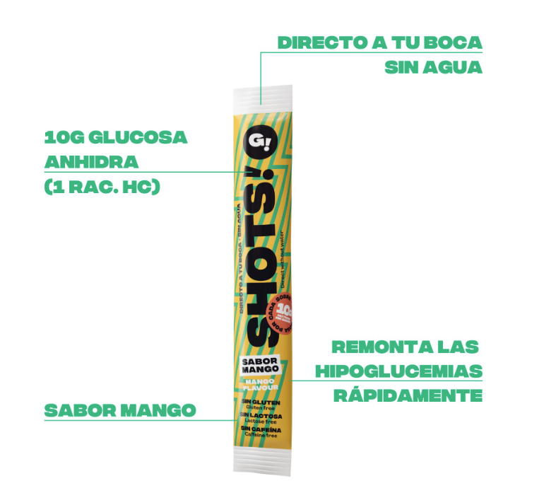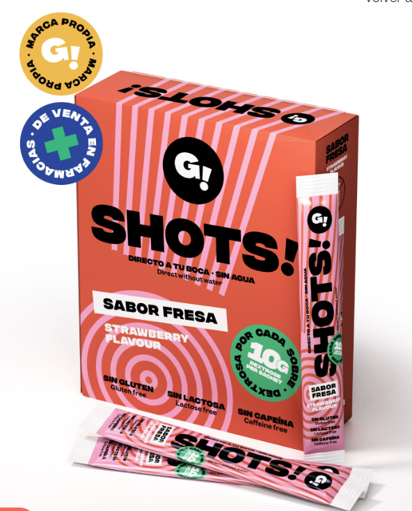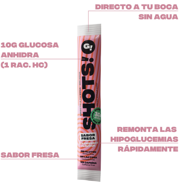 Caja 10 SHOTS de glucosa/dextrosa ANHIDRA. Cada sobre contiene 10 gr. de glucosa de acción rápida. Facil de usar: Rasgar y consumir directamente. No es necesario diluir en agua, aunque se puede mezclar si se desea en el momento del consumo. Ideal dejar que se disuelva en la boca antes de tragarlo. Consistencia granulada. Sin gluten. Sin lactosa. Sin cafeina. Ingredientes: Dextrosa ANHIDRA (98%), antiaglomerante, ácido cítrico, aroma.